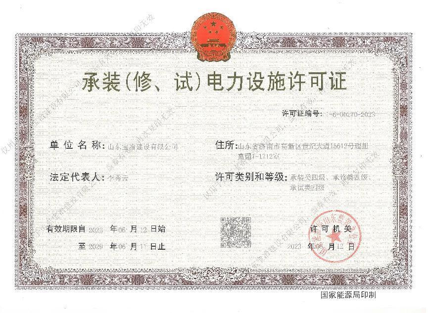 近日,公司在原有電力施工總承包資質(zhì)的基礎(chǔ)上,成功取得了由國家能源局頒發(fā)的承裝(修、試)電力設(shè)施許可四級(jí)資質(zhì)。